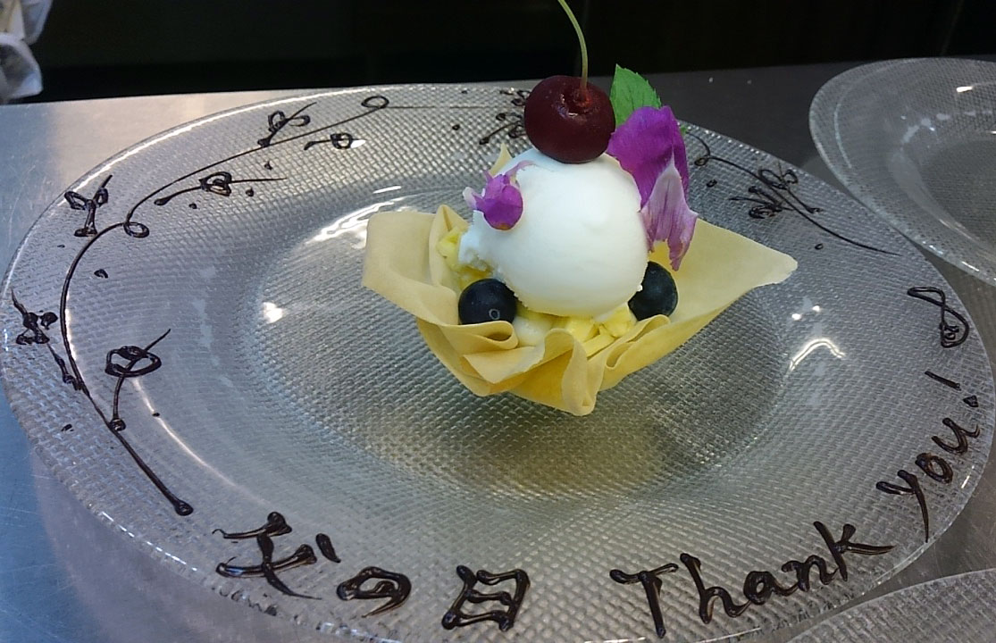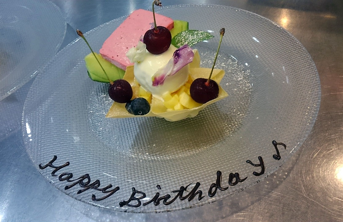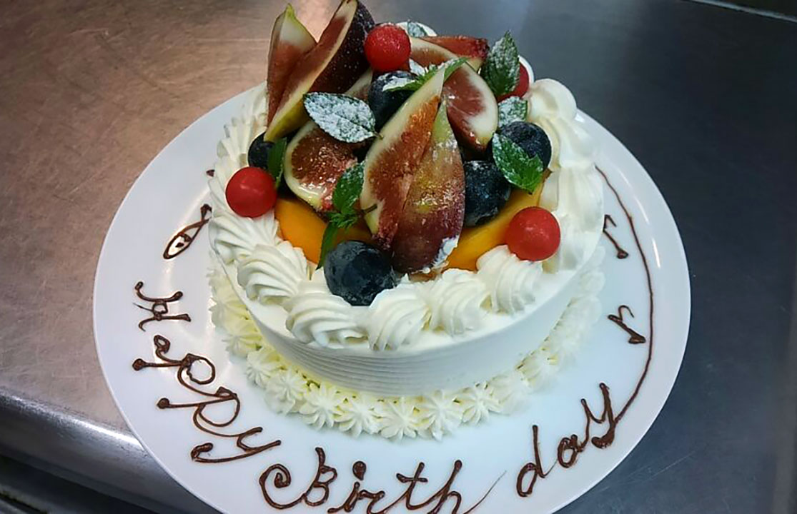 お祝いや記念日に、デザート皿へメッセージ、華やかな盛り付け(+880円)、ホールケーキをお焼きすることもできます。
